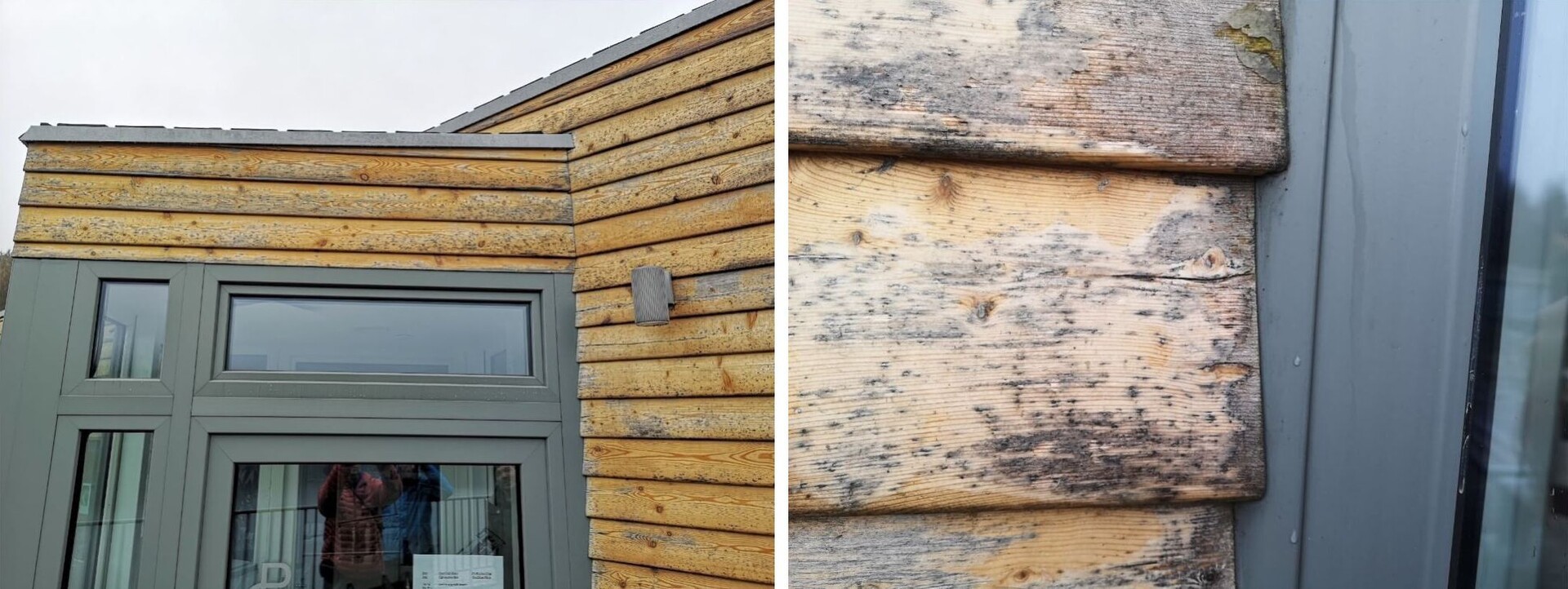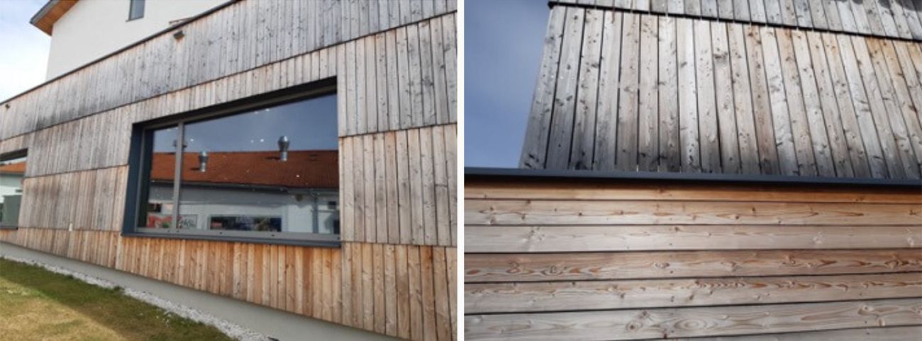 Výrazné zčernání u sibiřského modřinu na fasádě patrné již po 1 roce od stavby.