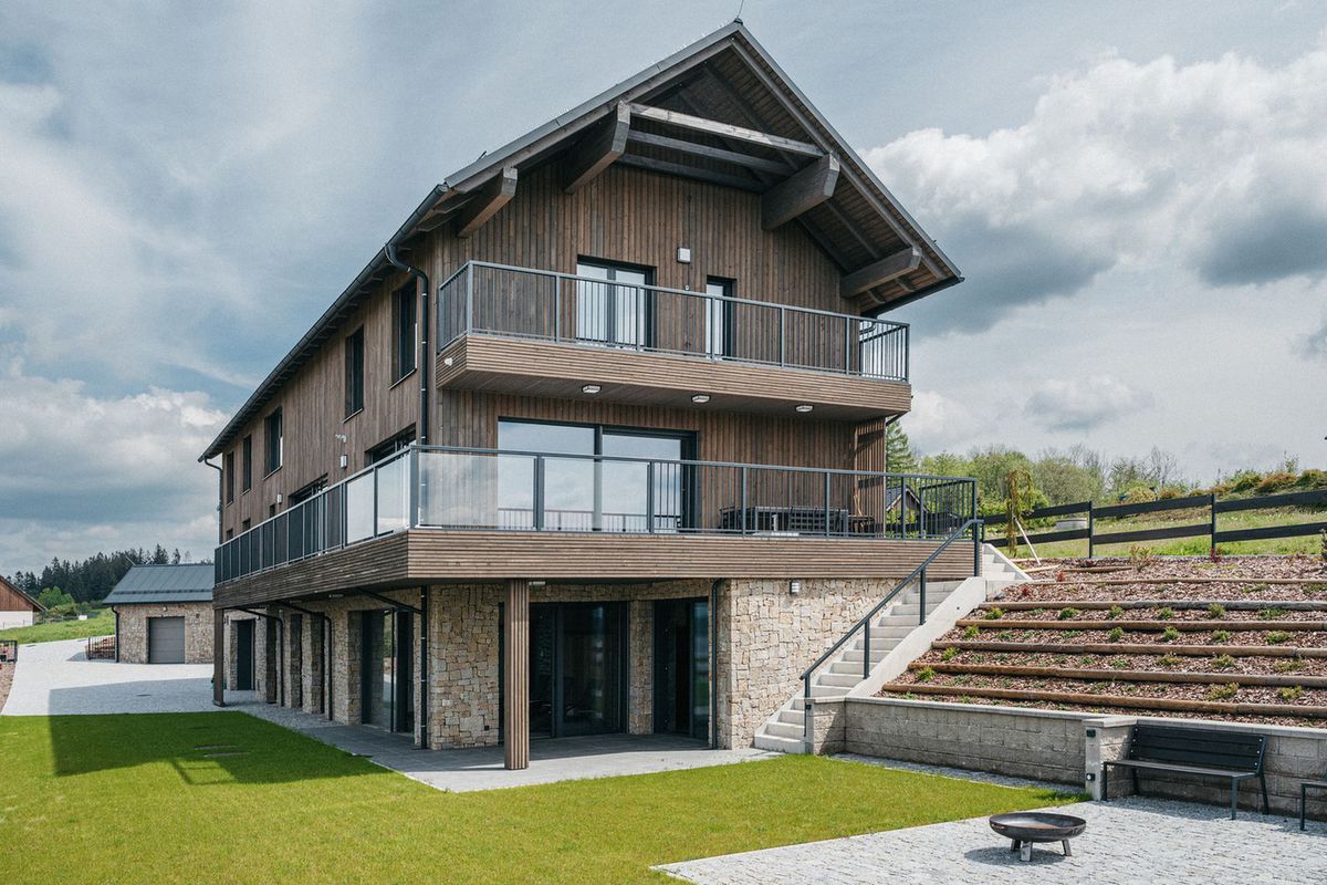 Ukázka obložení fasády rekreační budovy na břehu Lipna fasádním obkladem ošetřeným Královskou impregnací.
