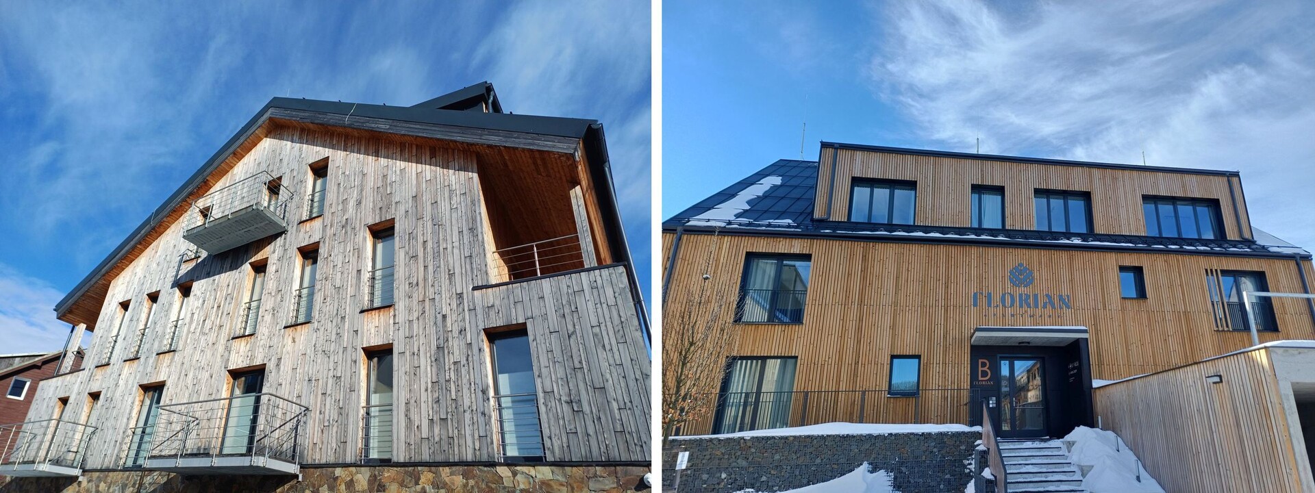 Srovnání modřínové fasády (foto vlevo) a fasády ošetřené technologií Profi impregnace (foto vpravo) po 4 letech od výstavby. Oba apartmánové komplexy se nacházejí na Šumavě a jsou nedaleko od sebe.