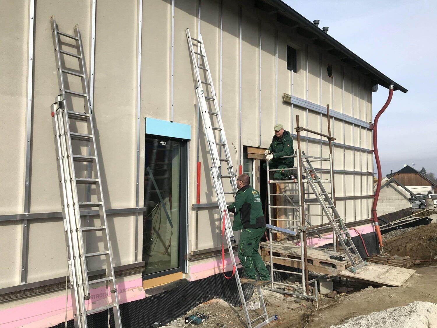 Pro stavbu konstrukce byly použity střešní latě formátu 40x60 mm ošetřeny vakuově-tlakovou impregnací (Profi impregnace). Latě jsou do zdiva připevněny pomocí natloukacích hmoždinek. Při montáži obkladových prken je velmi důležité neopomenout správný výběr vrutů. Klasické pozinkované vruty časem reznou a na fasádě zanechávají nežádoucí stopy. Proto pro tento dům byly použity nerezové fasádní vruty, které mají vysokou životnost a estetický vzhled.