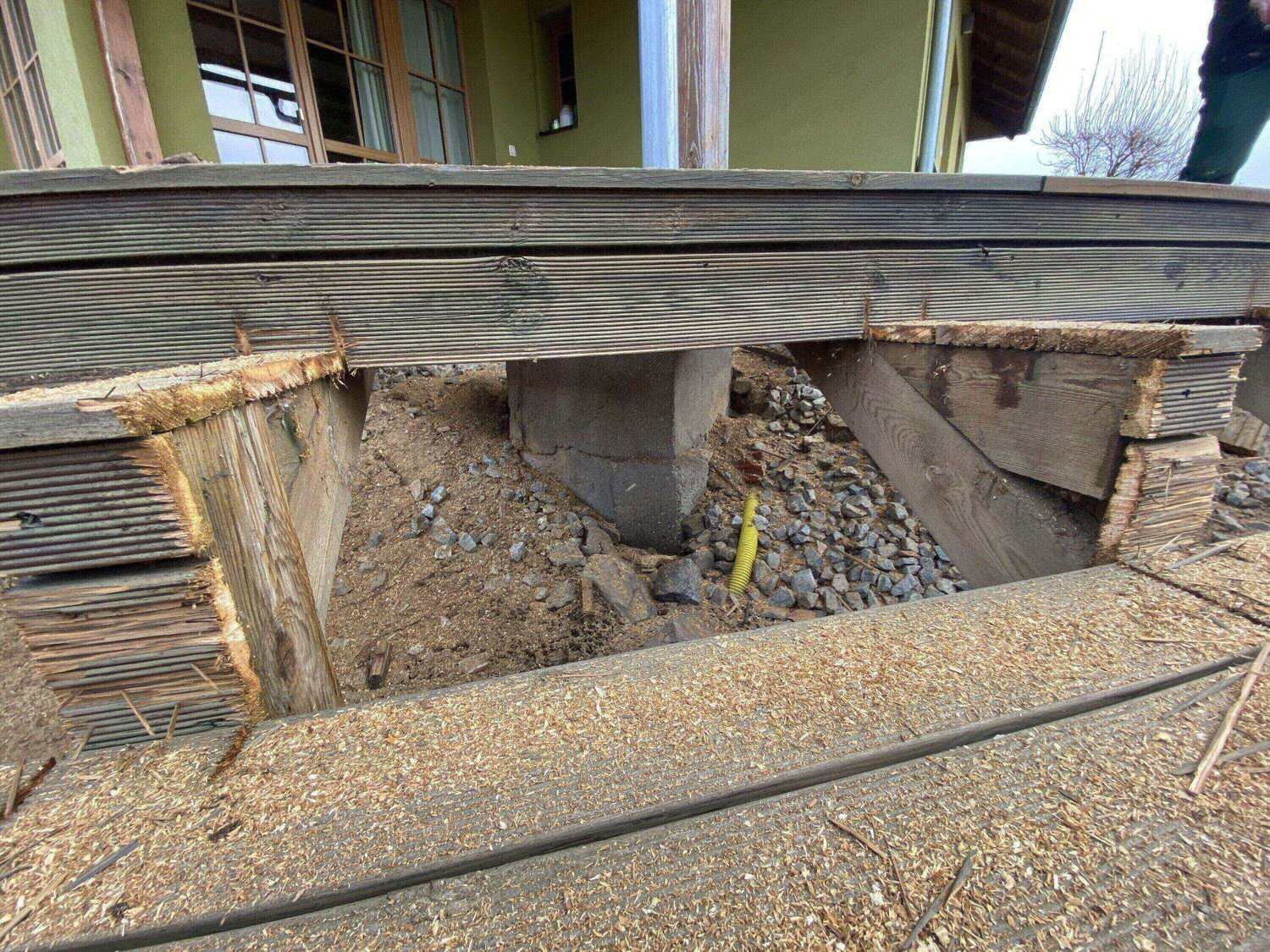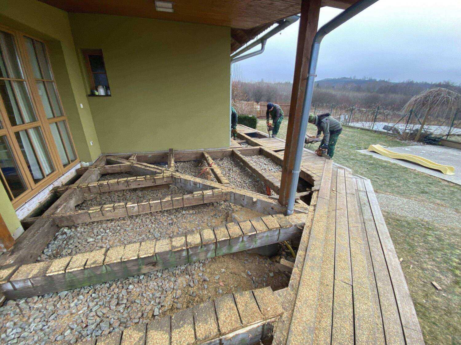 Rošt původní terasy byl vyroben z neimpregnovaného jehličnatého dřeva, a jak je patrné z naší fotodokumentace, během pouhých deseti let došlo k jeho neuvěřitelné degradaci. Stejně dopadla i neimpregnovaná terasová prkna. Jak rošt tak i terasová prkna jsme musely při demontáži původní terasy kompletně zlikvidovat.